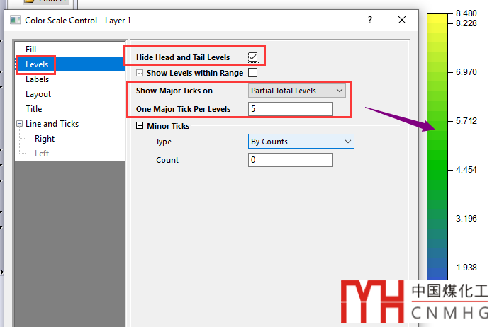 雙擊Color Scale Bar,進行格式設置。切換到Levels頁面,勾選Hide Head and Tail Levels,選擇Partial Total Levels,數字設為5或者其他合適的值。