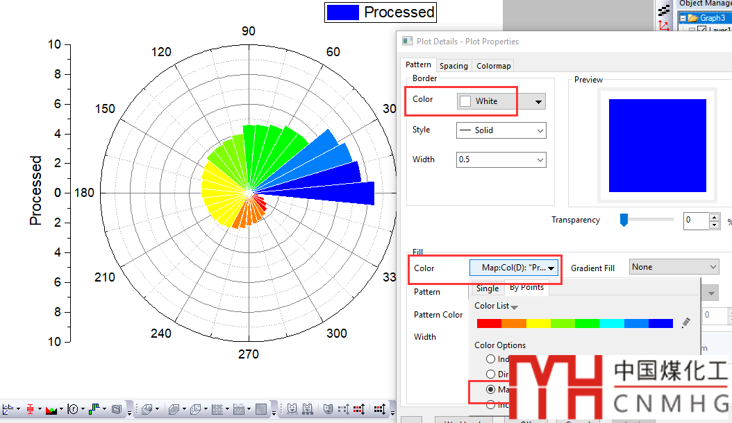 在Pattern中,將Border Color選為白色,將Fill Color設為Map,數據來源設為“Col(D): Processed”。