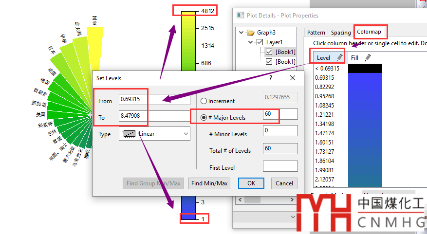 問題來了,Color Scale Bar的最大值和原始數據中的最大值不一致(此處為4816,原數據為4812),原因是繪圖的過程中涉及了數據的變換,在小數點的取舍上出了問題。解決方法是在圖形的Plot Properties/Colormap里,在Levels下的From和To中填寫Y軸數據中的最小值和最大值,而且最好精確到小數點多幾位,同時Major Levels中填的數盡量大一些,顏色過渡會平滑、好看。