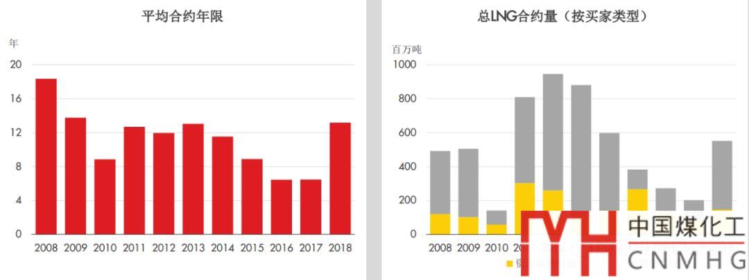 2018年,全球新簽LNG長協(xié)出現(xiàn)反彈,合同平均期限為13年,比2017年的6年增長了一倍多,總合同量也翻了一番多,達(dá)到近6億噸。新的LNG項(xiàng)目通常需要通過長期購銷合同來獲得融資,因此,長協(xié)復(fù)蘇將有助于全球LNG的長期健康發(fā)展。