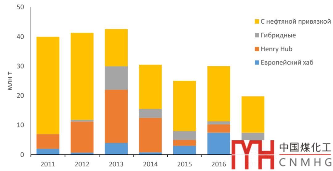 圖2 2011~2017年全球掛鉤各種價(jià)格指數(shù)的新簽LNG供貨合同