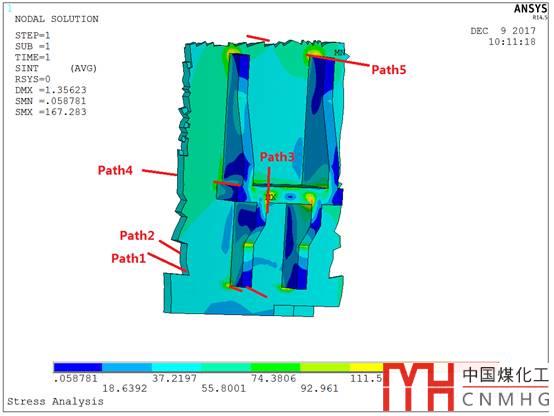 對(duì)比上一床層筒體上的牛腿,30Kpa的壓降,勉強(qiáng)通過(guò)。現(xiàn)在由于下封頭的加強(qiáng)作用,同樣的路徑1,40KPa的壓降,還有4Mpa的余量??磥?lái)下封頭的加強(qiáng)效果很明顯啊。