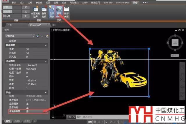 選中插入的圖像,在CAD高版本中會自動顯示“圖像”面板,其中包括圖像相關的各種編輯工具,其中有一個功能是“背景透明度”,如果用的版本比較低,可以選中圖像后在特性面板(CTRL+1)中設置圖像透明,如圖所示。