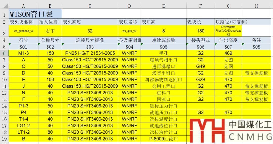 D3單元格:管口表的塊名稱,表的內(nèi)容按照公司的規(guī)定制作。里面文字部分和第5行要一一對(duì)應(yīng)。