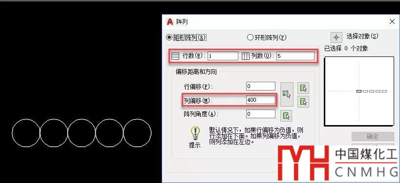 1、先設(shè)置列數(shù)為5,行數(shù)為1,列偏移為400,得到橫向的一行圓,如下圖所示。