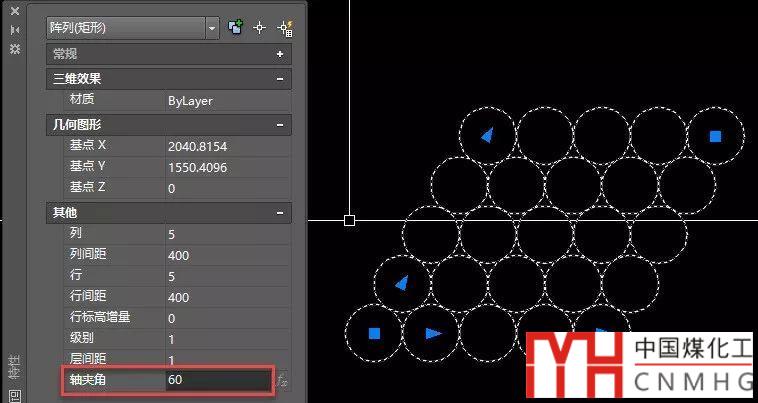 2、關(guān)閉陣列后再選中陣列,打開特性面板(CTRL+1),將陣列的軸夾角修改為60,陣列就創(chuàng)建好了,如下圖所示。