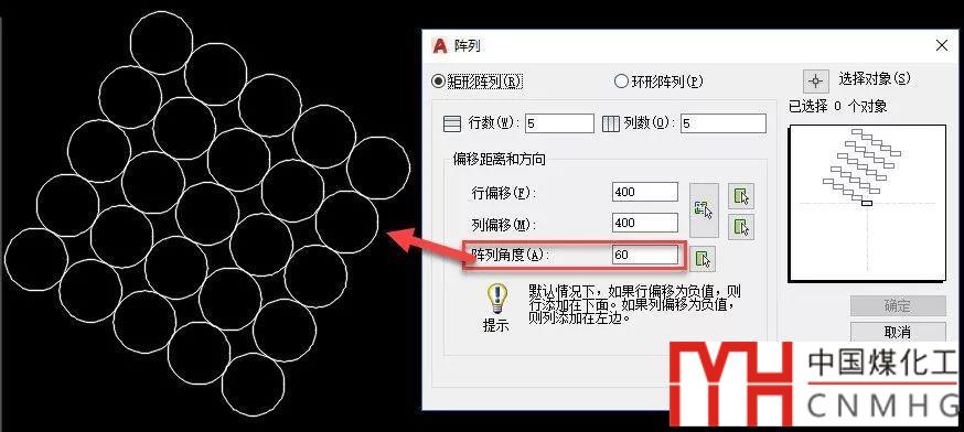設(shè)置行數(shù)和行間距,就需要旋轉(zhuǎn)-30度,設(shè)置列數(shù)和列陣列,就需要旋轉(zhuǎn)60度。大家如果需要完成其他角度的傾斜陣列,也可以參照這張示意圖來確定方式和角度。