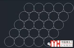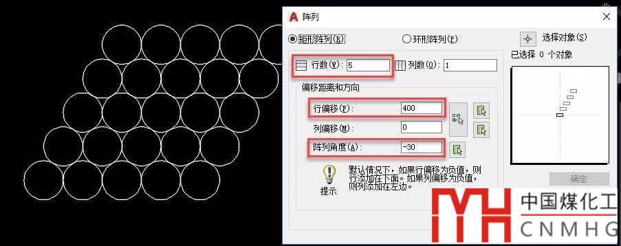 2、選擇陣列好橫向排列的5個圓,執(zhí)行陣列功能,設(shè)置成5行,間距400,旋轉(zhuǎn)角度設(shè)置為-30,就可以得到最終的效果,如下圖所示。