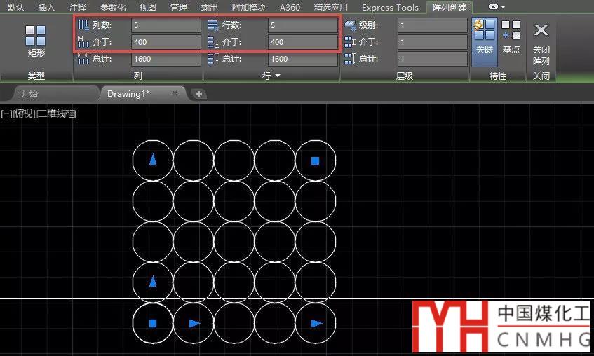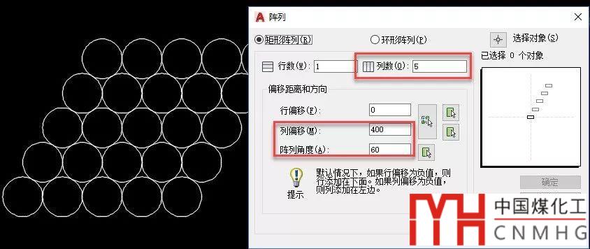 3、選擇陣列好橫向排列的5個圓,執(zhí)行陣列功能,設(shè)置成5列,間距400,旋轉(zhuǎn)角度設(shè)置為60,也能得到相同的效果,如下圖所示。