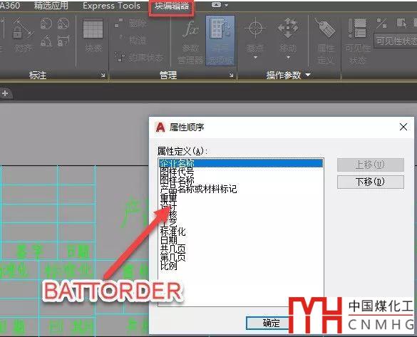 選中屬性塊,右鍵單擊,在菜單中選擇塊編輯器,或者直接輸入BEDIT回車,進(jìn)入塊編輯器,此時(shí)就可以輸入BATTORDER命令,然后就可以彈出“屬性順序”對話框,在此對話框中就可以調(diào)整屬性的順序了,如下圖所示。