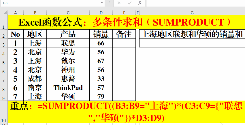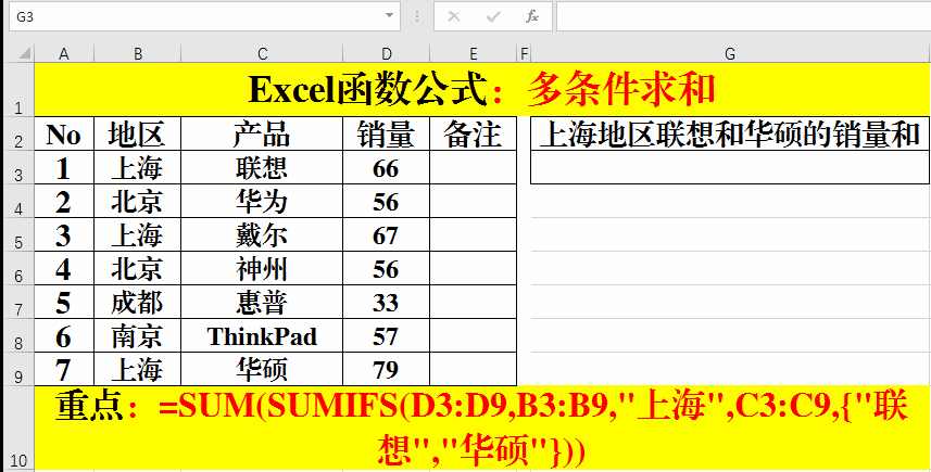 在目標(biāo)單元格中輸入公式:=SUM(SUMIFS(D3:D9,B3:B9,"上海",C3:C9,{"聯(lián)想","華碩"}))。