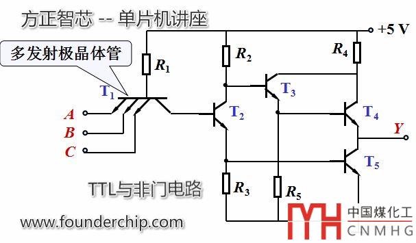 在數(shù)字電子技術(shù)中,使用晶體管(三極管)可以構(gòu)成不同的邏輯電路,常見的有“TTL與非門電路”、“TTL或非門電路”、“集電極開路與非門電路”等等。下面這張圖,是TTL與非門電路的電路圖: