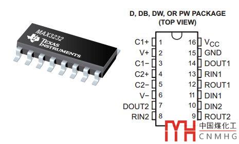 下面這張圖,是MAX3232的外觀與引腳圖: