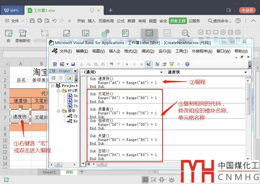 點(diǎn)擊按鈕右鍵選擇“指定宏”,在彈出的VB編輯器中,輸入程序代碼:range("A6") =range("A6")+1。由于每個(gè)按鈕的運(yùn)行事件都是累加操作,所有的模塊代碼均相似,只需要修改模塊名稱(chēng)及代碼中單元格即可。如圖5所示。