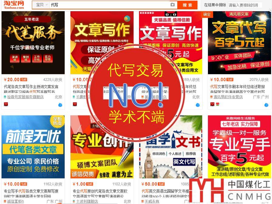 圖1是萬(wàn)能某寶網(wǎng)(什么都可以買(mǎi)賣(mài)?。┥?ldquo;代寫(xiě)”關(guān)鍵詞搜索到的截圖(共4400多條結(jié)果,圖1僅顯示極少部分,圖中圓圈圖案是譚編打上去的圖章!