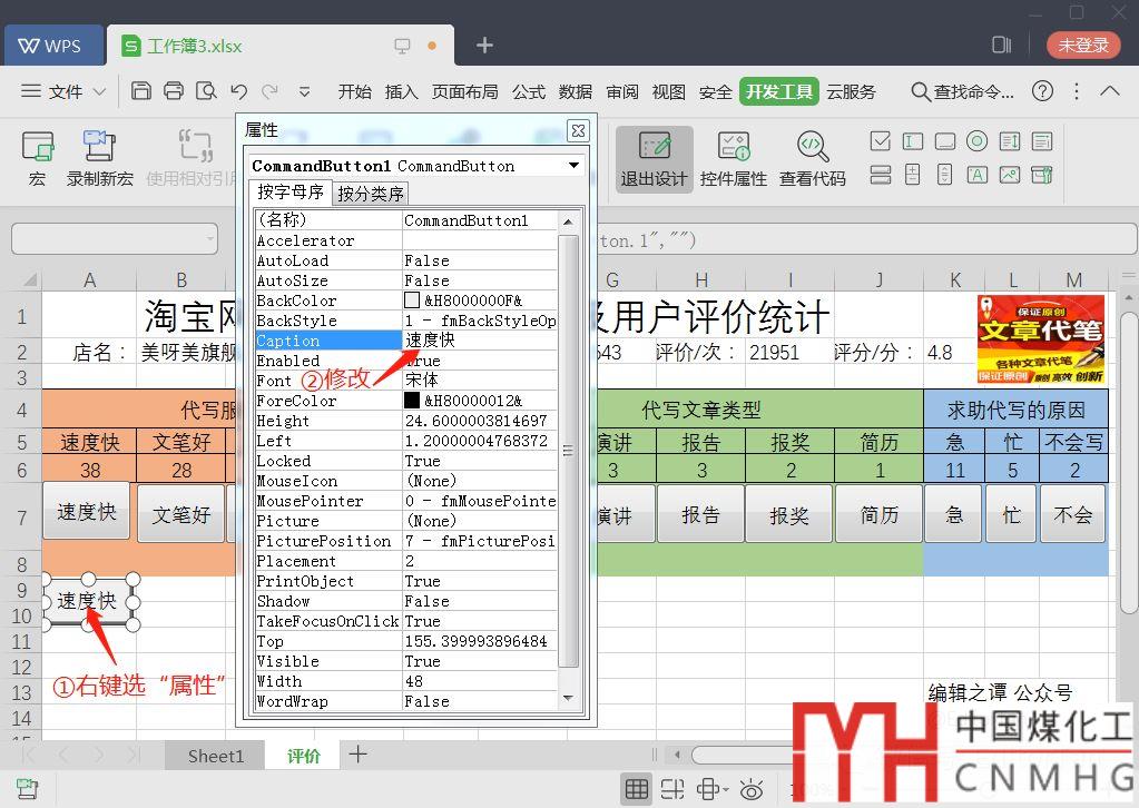 修改按鈕的標(biāo)題:右鍵點(diǎn)擊按鈕,然后選擇“屬性”,即可彈出“屬性”對(duì)話框,將Caption右邊的屬性值改為想要的內(nèi)容,如“速度快”等。如圖4所示。