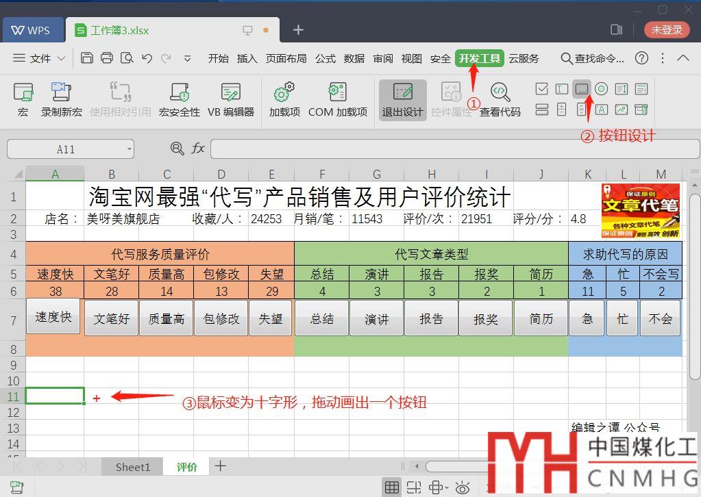 點(diǎn)擊菜單“開(kāi)發(fā)工具”,再點(diǎn)擊工具欄中的按鈕,鼠標(biāo)指針變?yōu)槭志€,可以在需要繪制按鈕的地方,拖動(dòng)鼠標(biāo)然后松開(kāi)鼠標(biāo)來(lái)實(shí)現(xiàn)對(duì)按鈕的繪制,如圖3所示。