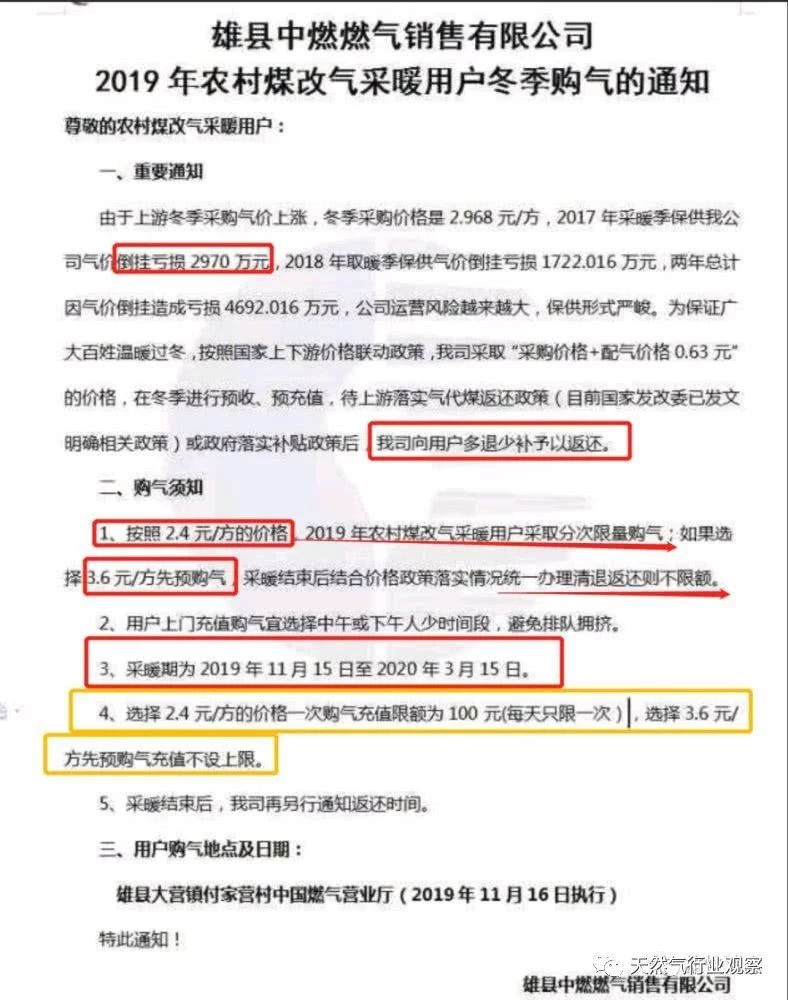 按照網(wǎng)傳的雄縣中燃燃?xì)怃N售有限公司的一份通知稱,由于上游冬季采購氣價上漲,冬季采購價格是2.968元/方,2017年采暖季保供該公司氣價倒掛虧損2970萬元,2018年取暖季保供氣價倒掛虧損1722.016萬元,兩年總計因氣價倒掛造成虧損4692.016萬元。