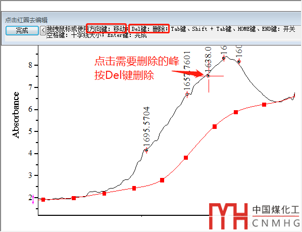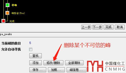 點(diǎn)擊“修改/刪除”按鈕,重新回到尋峰標(biāo)記的繪圖窗口,點(diǎn)擊需要?jiǎng)h除的峰,按Del鍵刪除,然后點(diǎn)擊“完成”
