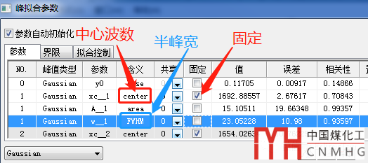 有時(shí)候,我們可以根據(jù)文獻(xiàn)數(shù)據(jù),對(duì)擬合峰的位置、高低進(jìn)行調(diào)整,并在“擬合控制”里勾選Fixed,再進(jìn)行擬合,以提高擬合精度。