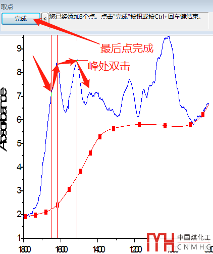 點(diǎn)擊“添加”后自動(dòng)返回到繪圖中,雙擊踩點(diǎn),最后“確定”,回到“峰值分析“對(duì)話框,點(diǎn)擊下一步,界面中選擇“B-樣條曲線”使基線曲線平滑。下一步,下一步,于是得到下面的界面。