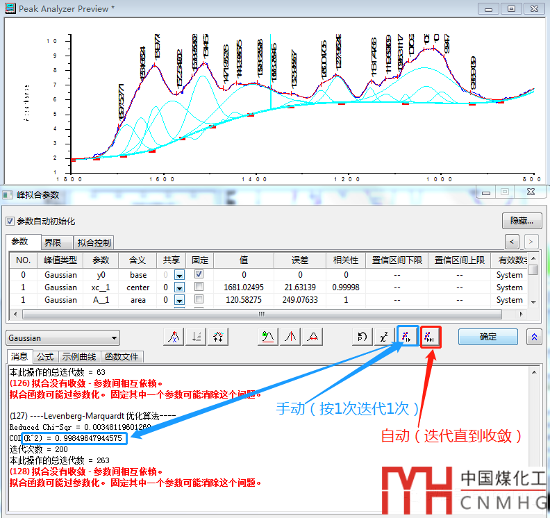 在擬合控制窗口,可以設(shè)置峰的中心波數(shù)固定,或者擬合后根據(jù)實(shí)際需要,再將每個(gè)峰的半峰寬設(shè)置為相同的某個(gè)值,再次點(diǎn)擊“一次收斂”擬合,直到滿意。