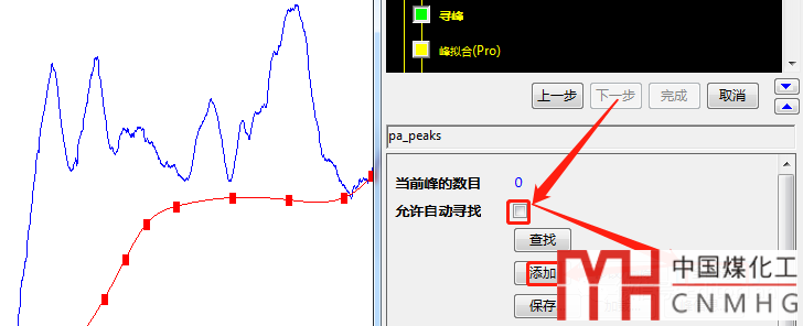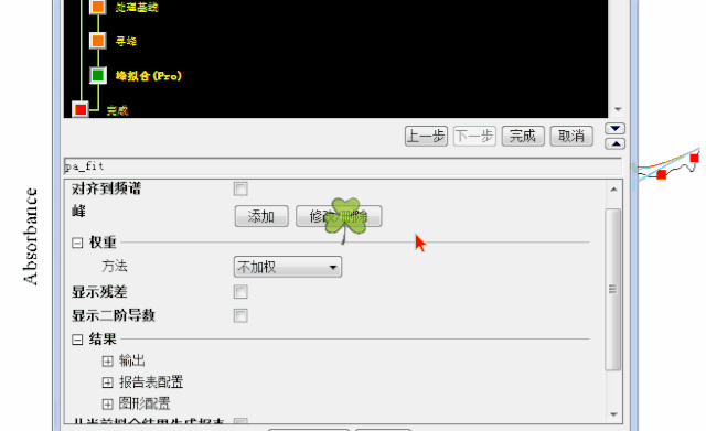 同樣,尋峰采取手動(dòng)。如果峰型完美可以“允許自動(dòng)尋找”。這里采用手動(dòng),去除自動(dòng)的勾選,點(diǎn)擊“全部清除”,點(diǎn)擊“添加”。在峰處雙擊,最后點(diǎn)擊“完成”