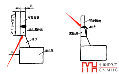 NB/T47023的4.4規(guī)定,當(dāng)與法蘭連接的圓筒厚度小于標(biāo)準(zhǔn)表1的最小值時(shí),應(yīng)將法蘭總高度H加長(zhǎng),如下圖所示。由下圖可以看出,這種情況下的H加長(zhǎng),只是直邊段變長(zhǎng)了,而法蘭盤厚度δ、錐頸長(zhǎng)度h是不變的。至于其他情況,如單獨(dú)將δ或h加長(zhǎng),H也應(yīng)加長(zhǎng),也就是說保證直邊段長(zhǎng)度。這部容器法蘭標(biāo)準(zhǔn)沒釋義,關(guān)于這個(gè)“與法蘭對(duì)接圓筒最小厚度”及“直邊段長(zhǎng)度調(diào)整”的內(nèi)容,可以參考文獻(xiàn):桑如苞. 關(guān)于壓力容器法蘭標(biāo)準(zhǔn)若干問題的建議[J]. 化工設(shè)備設(shè)計(jì), 1997, 34(5). 相關(guān)內(nèi)容整理如下:文獻(xiàn)指出,長(zhǎng)頸對(duì)焊法蘭主要是用于管殼式換熱器,這個(gè)“對(duì)接圓筒最小厚度”的規(guī)定也是以GB151編制組提出的要求為依據(jù)的。因?yàn)镚B151和GB150中有關(guān)圓筒最小厚度的要求不盡相同,所以長(zhǎng)頸對(duì)焊法蘭用在換熱器上,就是會(huì)經(jīng)常碰這個(gè)“最小厚度”的問題。(注:NB/T容器法蘭標(biāo)準(zhǔn)正是基于GB/T150中的法蘭計(jì)算方法。)首先,來看理想的情況:圓筒與法蘭直邊段等厚對(duì)接。文獻(xiàn)指出,此時(shí)直邊段與錐頸連接處(下方左圖中紅色箭頭所指)通常是法蘭應(yīng)力最大的地方,對(duì)于“標(biāo)準(zhǔn)的法蘭”這是核算過的,結(jié)構(gòu)的強(qiáng)度是有保證的。但對(duì)于圓筒與法蘭直邊的不等厚對(duì)接,因?yàn)橹圃斓男枰话愕脤⒅边叾蜗鞅≡倥c圓筒對(duì)接。這時(shí)候,直邊段削薄端與圓筒連接處(下方右圖紅色箭頭所指)成了法蘭應(yīng)力最大的地方,必須對(duì)這個(gè)地方的應(yīng)力重新進(jìn)行核算。這個(gè)“被削薄的直邊段”也可看作“錐頸”,且稱之為“錐頸2”,即可按GB/T150中法蘭錐頸的計(jì)算方法進(jìn)行校核。1、法蘭錐頸計(jì)算時(shí)要控制系數(shù)f=1,在錐頸大小端厚度確定的情況下,可以通過調(diào)整錐頸高度來保證f=1,詳見GB/T150.3的圖7-7。2、系數(shù)f=1的意思是,錐頸大端、小端的應(yīng)力相等。3、容器法蘭標(biāo)準(zhǔn)已經(jīng)對(duì)錐頸大端的軸向應(yīng)力水平進(jìn)行了控制,若f=1,小端也是安全的。這樣來看,長(zhǎng)頸對(duì)焊法蘭標(biāo)準(zhǔn)NB/T47023規(guī)定“對(duì)接圓筒厚度較小時(shí),應(yīng)將H加長(zhǎng)”也就容易理解了。問題來了,如果圓筒材料的許用應(yīng)力低于法蘭,在“錐頸2”大端、小端應(yīng)力相等時(shí),大端校核合格,小端可不一定就是合格的。那么此時(shí),標(biāo)準(zhǔn)給定的H修正值是否足夠?還要不要再增加“錐頸2”的高度,以降低小端的應(yīng)力水平呢?襯不銹鋼的碳鋼法蘭在與不銹鋼圓筒對(duì)接時(shí),是可能遇到這樣的問題的。對(duì)于碳鋼法蘭+碳鋼圓筒則不會(huì),為啥?看下面幾張圖中給出的碳鋼鍛件 、碳鋼板、不銹鋼板的許用應(yīng)力可以發(fā)現(xiàn):類似于16Mn鍛+Q345R圓筒,20鍛+Q245R圓筒,圓筒鋼板的許用應(yīng)力都是高于或者接近于法蘭鍛件的,法蘭都合格了,圓筒自然沒問題。但如果是襯304的16Mn鍛件法蘭+304圓筒,304許用應(yīng)力是比16Mn鍛件低一些的,對(duì)于低碳不鋼鋼更甚。解決辦法:1、按GB/T150.3進(jìn)行校核;2、將法蘭的等級(jí)選高,即法蘭最大允許工作壓力與設(shè)計(jì)壓力比值,放大一點(diǎn),留出裕量。