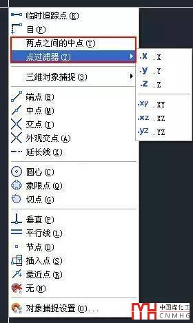 我們可以看到,相對(duì)工具欄,這里又增加了三個(gè)選項(xiàng),“兩點(diǎn)之間的中點(diǎn)”、“點(diǎn)過濾器”及“三維對(duì)象捕捉”。當(dāng)兩點(diǎn)之間沒有連線時(shí),利用“兩點(diǎn)之間的中點(diǎn)”可以捕捉圖中兩個(gè)點(diǎn)之間的中點(diǎn)。“點(diǎn)過濾器”則可以設(shè)置捕捉時(shí)只獲取某個(gè)點(diǎn)的某個(gè)坐標(biāo)值,例如可以只獲取一個(gè)點(diǎn)的X坐標(biāo),然后再獲取另一個(gè)點(diǎn)的Y坐標(biāo)。三維對(duì)象捕捉中除了常規(guī)的捕捉選項(xiàng)外,還有面中心以及最靠近面的選項(xiàng)。
