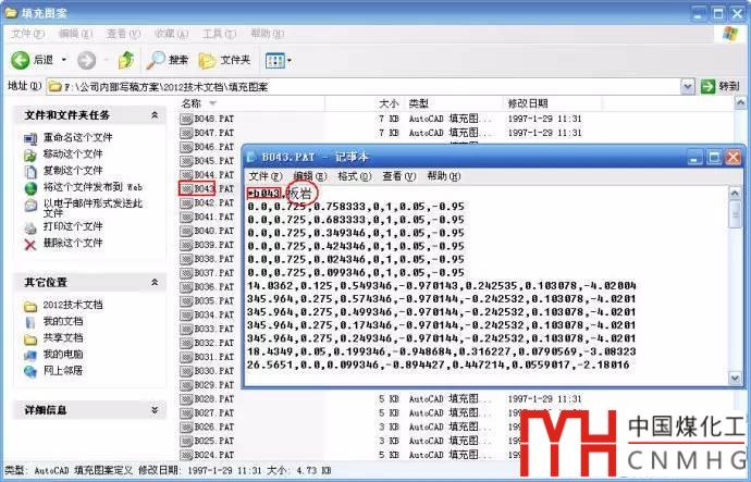 圖中打開(kāi)的填充名為b043,文件名也必須為b043,否則CAD是不認(rèn)的。類似上圖所示的填充,如果希望CAD的填充列表中直接顯示中文,方便查找,你就需要先用記事本將PAT文件打開(kāi),復(fù)制“板巖”,選中b043,粘貼將其替換成“板巖”,關(guān)閉并保存文件。選中文件后單擊文件名進(jìn)入重命名狀態(tài),選中前面的B043,CTRl+V粘貼,將"B043.pat"修改成"板巖.pat"。