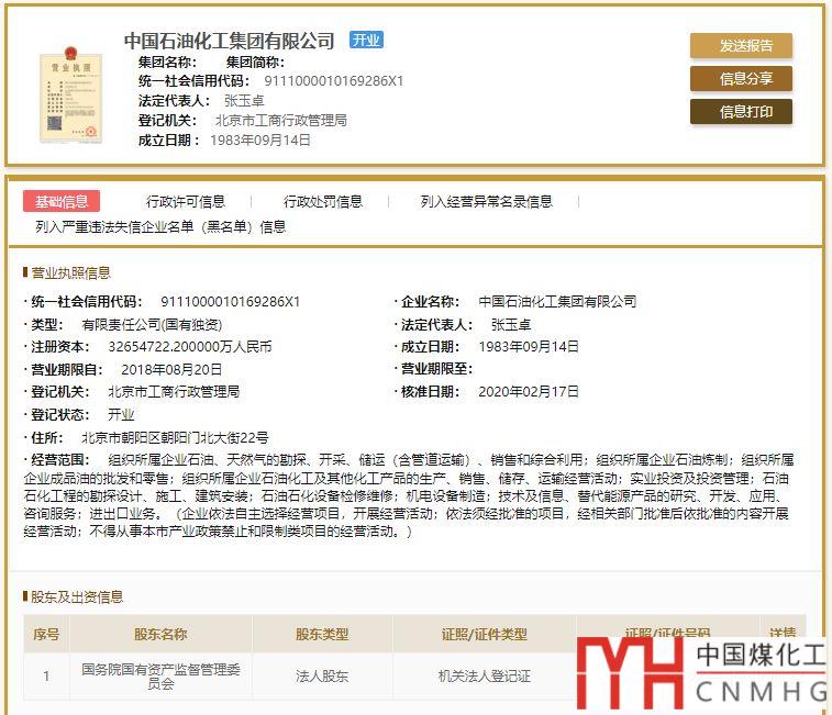 2020年2月17日,中國石油化工集團公司正式變更公司名稱為中國石油化工集團有限公司,目前公司法定代表人為張玉卓,股東為國資委,公司類型為有限責(zé)任公司(國有獨資)。
