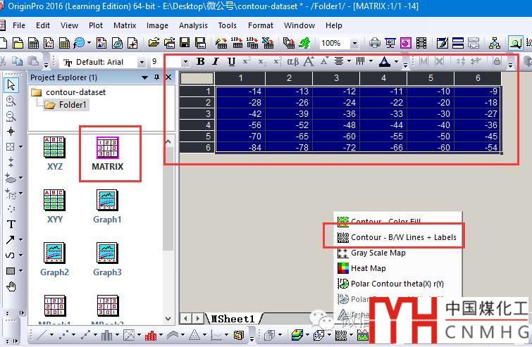 Matrix格式的數(shù)據(jù)與XYZ格式的數(shù)據(jù)一樣, 點擊一下Contour -B/W Lines + Labels即可。