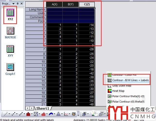 XYZ格式的數(shù)據(jù)繪制Contour圖很簡單,點擊一下Contour -B/W Lines + Labels即可。