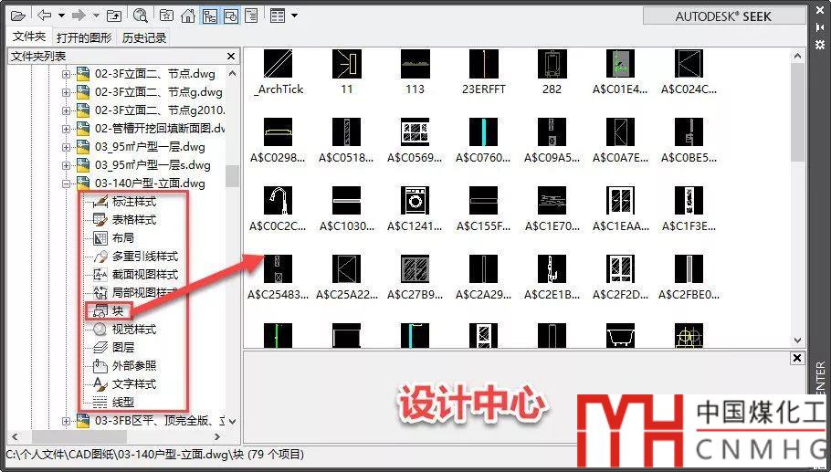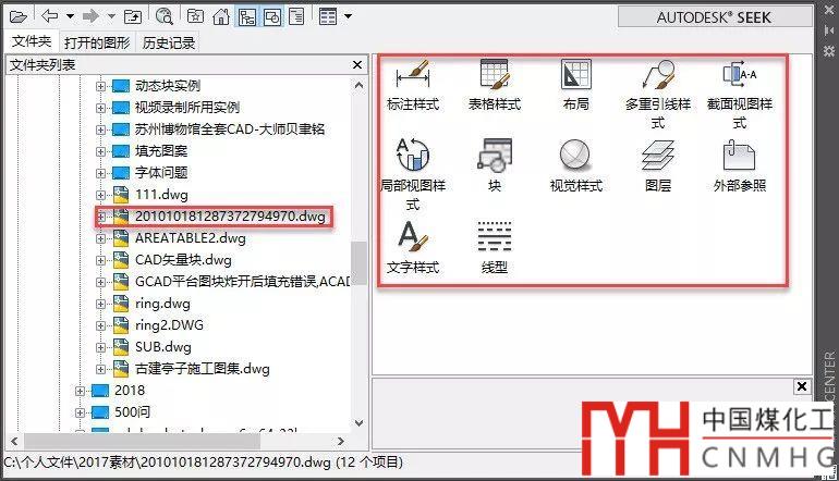 在左側(cè)列表選擇要給DWG或DXF文件后,右側(cè)列表就會(huì)顯示設(shè)計(jì)中心可訪問(wèn)的數(shù)據(jù)類型,如下圖所示。