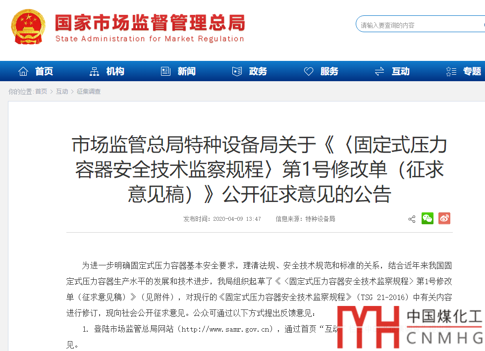 為進一步明確固定式壓力容器基本安全要求,理清法規(guī)、安全技術規(guī)范和標準的關系,結合近年來我國固定式壓力容器生產(chǎn)水平的發(fā)展和技術進步,我局組織起草了《〈固定式壓力容器安全技術監(jiān)察規(guī)程〉第1號修改單(征求意見稿)》(見附件),對現(xiàn)行的《固定式壓力容器安全技術監(jiān)察規(guī)程》(TSG 21-2016)中有關內(nèi)容進行修訂,現(xiàn)向社會公開征求意見。公眾可通過以下方式提出反饋意見: