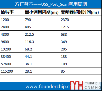 下面這張表格列出了不同波特率情況下的USS_Port_Scan的最小調(diào)用周期(ms)和變頻器的超時(shí)時(shí)間(最小調(diào)用周期的3倍):