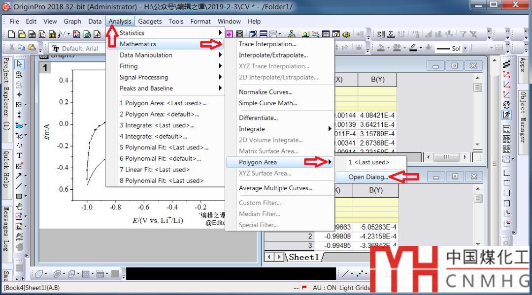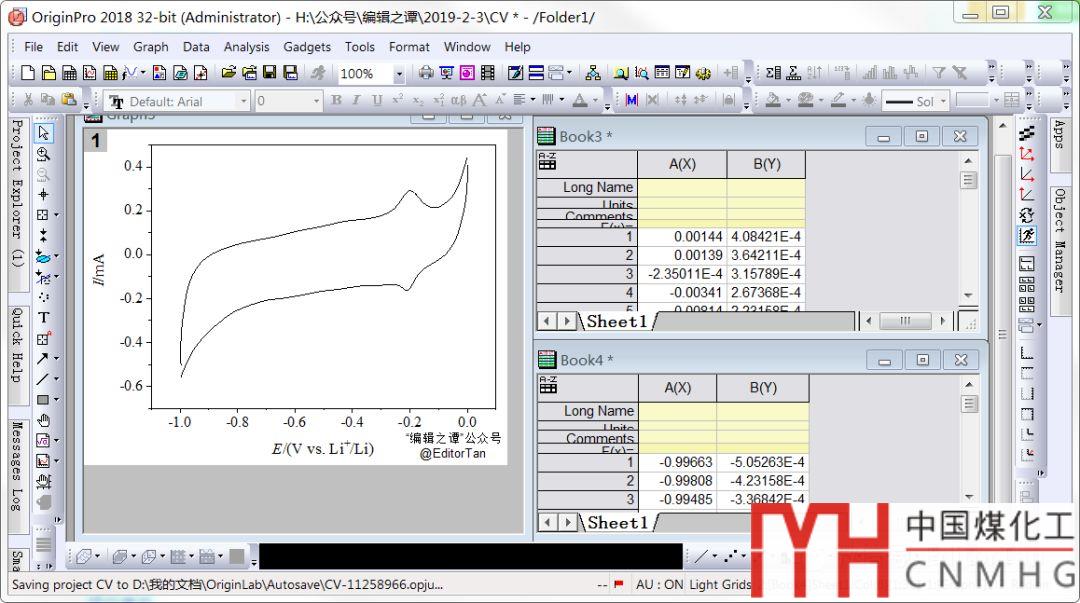 下面利用獲取的數(shù)據(jù),演示基線以上峰面積的求解與繪制過(guò)程。由于不是原始數(shù)據(jù),氧化峰與還原峰有點(diǎn)不對(duì)稱,不過(guò)沒(méi)關(guān)系,這里只是演示怎樣利用Origin繪圖實(shí)現(xiàn)峰面積的計(jì)算。