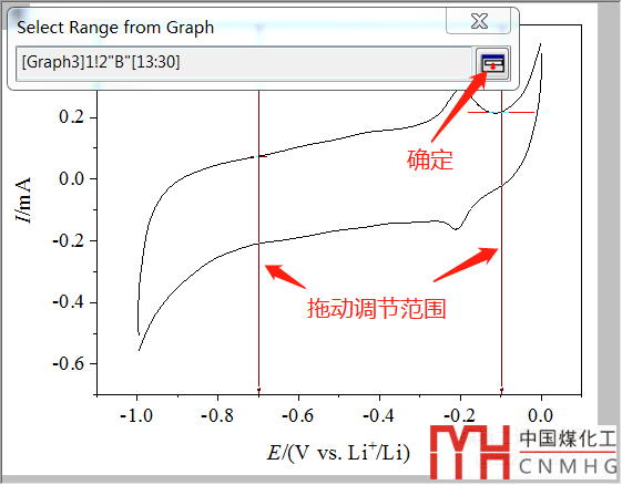 點(diǎn)擊紅箭按鈕后,操作界面回到繪圖區(qū)。拖動(dòng)兩條暗紅色的豎線到想要的范圍(這里是-0.7~-0.1V),然后點(diǎn)擊紅箭按鈕。具體操作如圖6所示。