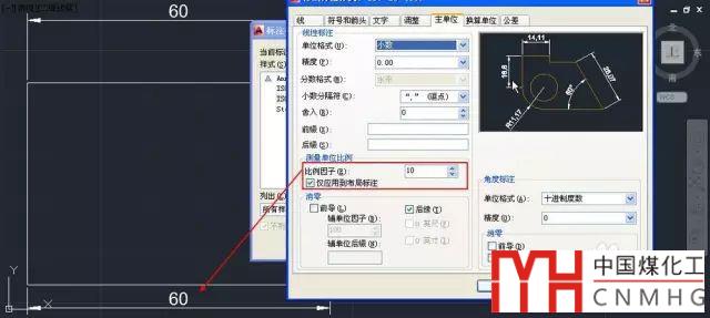 單擊“主單位”選項(xiàng)卡,找到測(cè)量單位比例,在比例因子框中輸入10,如圖所示。