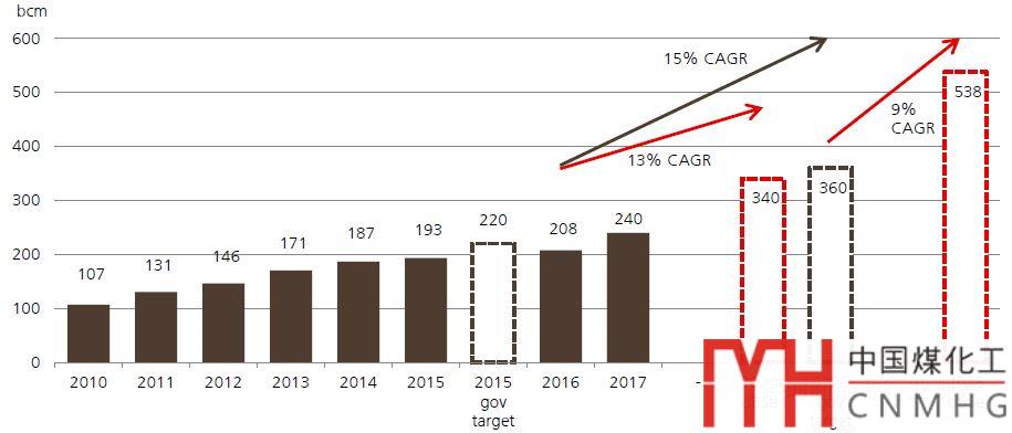 行業(yè)預測基本每個機構(gòu)都會做,千差萬別,隨便選了UBS做的預測,相對比較靠譜。國家十三五規(guī)劃是2020年超過3600億方,不過氣價上漲趨勢會在一定程度上限制終端消費增長,尤其是工業(yè)和發(fā)電,竊以為,十三五期間15%CAGR基本是有點癡人說夢……2020年消費暫按UBS的3400億方吧
