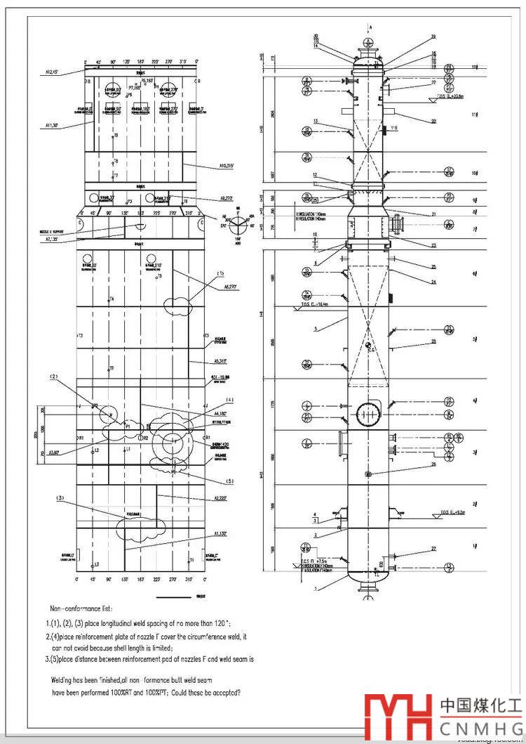 2. 展開圖為了將錯誤消除在萌芽狀態(tài)。比如爬梯墊板,外壓加強圈等與焊縫間隔太近,這時及時修改圖紙,可以避免施工時再去修改,使圖紙更合理。