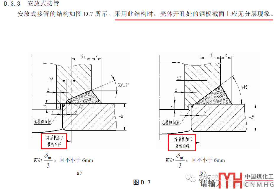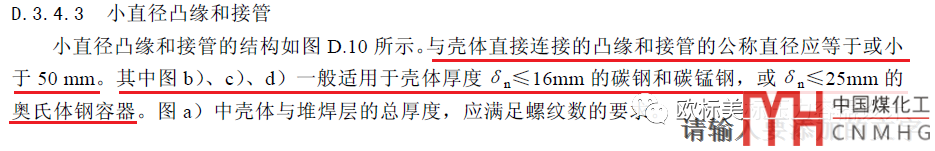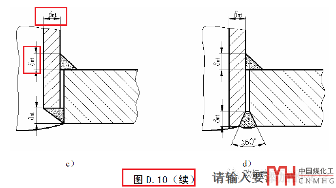 小接管的焊腳:有部分行業(yè)或設(shè)備會(huì)用到較多的小且比較薄的接管,例如φ48x3的小接管,如果要按GB/T 150.3附錄D的圖D.3和D.4的規(guī)定焊腳要6mm太厚了接管焊接稍微不注意就變形了而且覺(jué)得也沒(méi)必要焊那么多。是否可以把焊腳焊接的小一點(diǎn),實(shí)際上在圖D.10是有明確規(guī)定的見(jiàn)下圖。