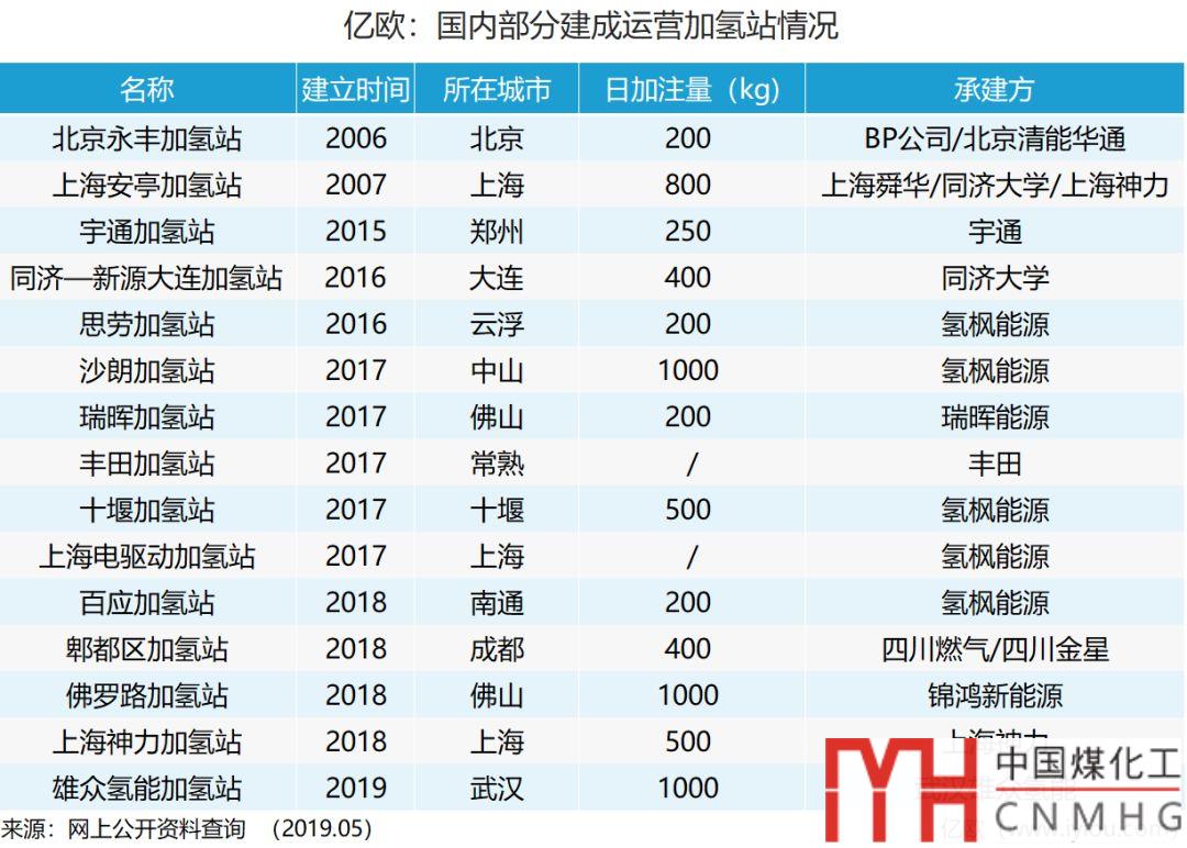 通過上表顯示,目前運營的加氫站主要分布在廣東和上海兩地區(qū), 加氫站大規(guī)模建設(shè)主要集中在2017年到2018年之間,日加氫量在200kg到1000kg之間不等,值得一提的是,表中顯示有5座加氫站都是由氫楓能源一方獨立承建,億歐汽車預(yù)計,隨著政策紅利推動,各地區(qū)開始落實規(guī)劃,相關(guān)承建企業(yè)單位技術(shù)的成熟,加氫站在2019~2020年間將會有一定的數(shù)量增長。