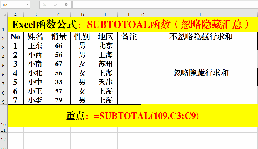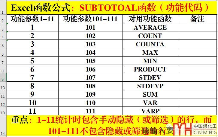 現(xiàn)在我們可以將SUBTOTAL函數(shù)的功能進行總結一下:=SUBTOTAL(功能代碼,統(tǒng)計區(qū)域)。代碼已經(jīng)在上圖了,大家對照應用就行了。趕快動手試一試吧……但是需要注意的事:1-11統(tǒng)計時包含手動隱藏(或篩選)的行,而101-111不包含隱藏或篩選的行。