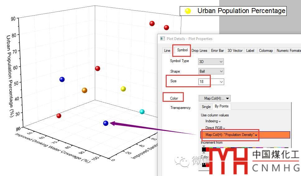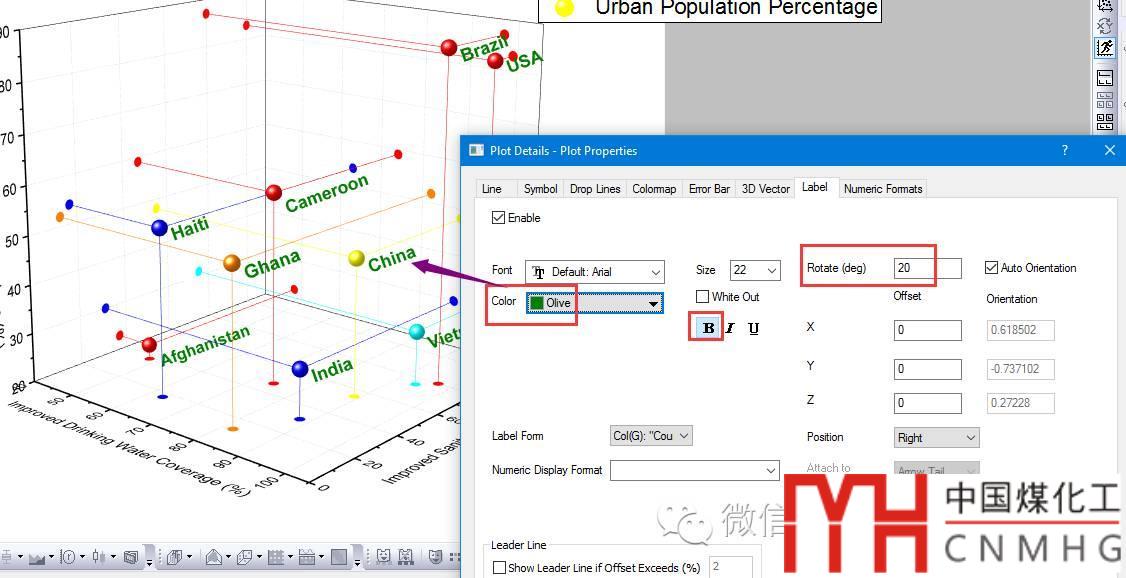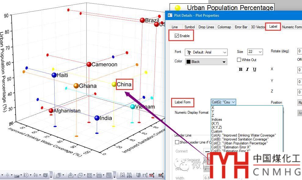 標(biāo)簽(Label):在Label選項(xiàng)卡下,勾選Enable顯示標(biāo)簽,Label from中選擇Col(G): Country,即以G列數(shù)據(jù)為標(biāo)簽。同樣可以設(shè)置標(biāo)簽的顏色、字體、位置、旋轉(zhuǎn)角度以及Leader Line等。