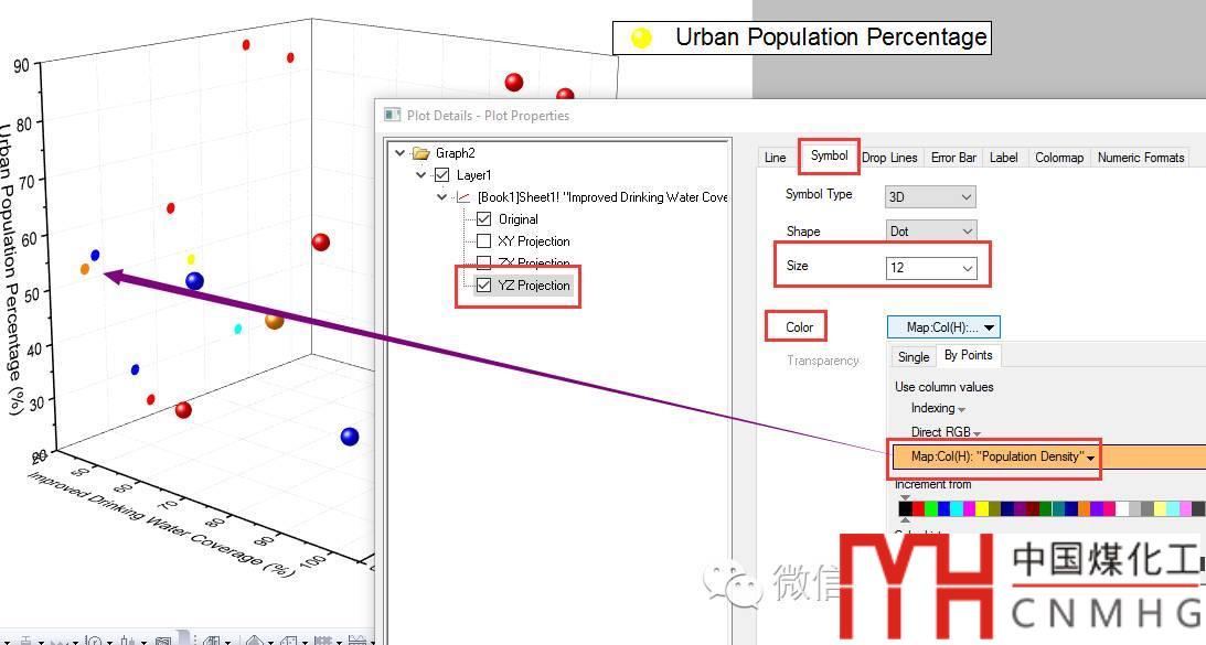 投影(Projection):在Plot Details對(duì)話框下,勾選Original下面的Projiection選項(xiàng),即可在坐標(biāo)屏幕上顯示散點(diǎn)的投影(Projection),同樣可以設(shè)置投影(Projection)點(diǎn)的大小、顏色等格式。