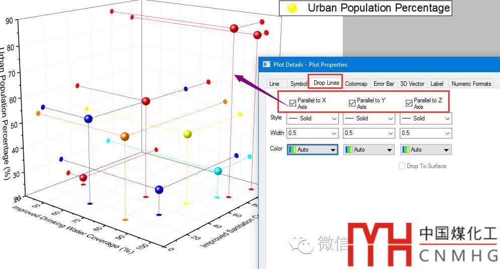 垂線(Drop lines):在Drop Lines選項(xiàng)卡下,勾選Parallel to X/Y/Z Axis,同樣可以設(shè)置垂線(Drop lines)的顏色等格式。