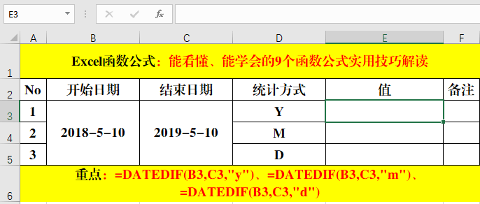 Datedif函數(shù)為系統(tǒng)隱藏函數(shù),作用為計(jì)算兩個(gè)日期之間的差值。語(yǔ)法結(jié)構(gòu)為:=Datedif(開(kāi)始日期,結(jié)束日期,統(tǒng)計(jì)方式),常用的統(tǒng)計(jì)方式有“Y”、“M”、“D”三種,分別為“年”、“月”、“日”。
