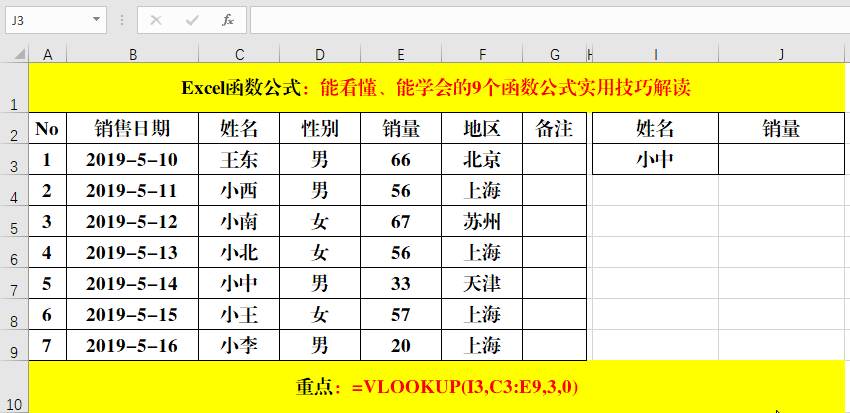 在目標(biāo)單元格中輸入公式:=VLOOKUP(I3,C3:E9,3,0)。