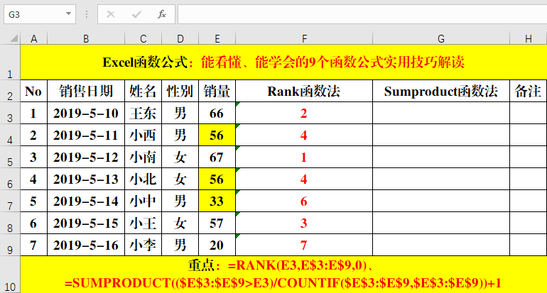 此用法為Sumproduct函數(shù)的經(jīng)典用法。對(duì)Rank函數(shù)和Sumproduct函數(shù)的排序結(jié)果對(duì)比可以發(fā)現(xiàn),如果排序相同,Rank函數(shù)會(huì)出現(xiàn)“跳躍”的情況,而Sumproduct函數(shù)不會(huì)哦!